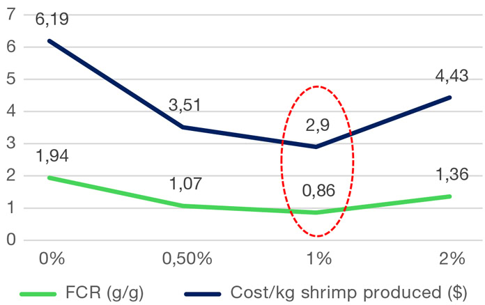 As shown in Figure 3, results from the trial showed that supplementation with OceanFeed™ Aqua at a 1% inclusion rate resulted in a better FCR and demonstrated significant reductions in cost per kilogram of shrimp produced, proving to be economically beneficial for shrimp farming.