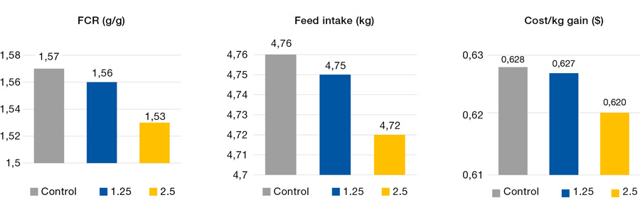 In one study, 720 Vencobb 430 Y male broiler chickens were used to evaluate the impact of OceanFeed™ Poultry on feed efficiency. The birds were fed corn-soybean meal-based diets, with OceanFeed™ Poultry added at 0, 1.25, or 2.5 kg/ton of feed. The study followed a completely randomized design, with 12 replicate pens per treatment group, each containing 10 chicks. The results revealed that the inclusion of OceanFeed™ Poultry significantly improved FCR and reduced Feed Intake when compared to the control group, as illustrated in Figure 1. These findings indicate that the addition of OceanFeed™ Poultry led to a more efficient feed utilization in broilers. Moreover, OceanFeed™ Poultry inclusion also had a significant impact reducing the cost per kilogram of weight gain, particularly at the highest dose (2.5%) (Figure 1). These conclusions demonstrate that OceanFeed™ Poultry has the potential to enhance feed efficiency, boosting productivity, and reducing production costs in broiler chickens, making it a valuable feed ingredient for the poultry industry.