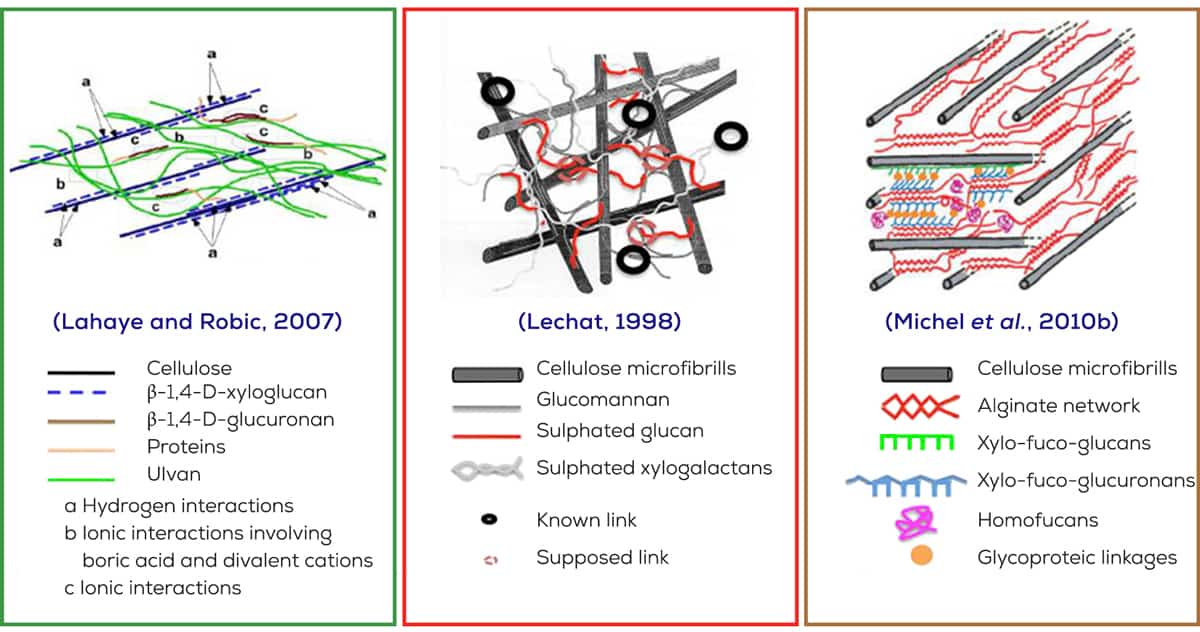 The numerous seaweeds identified contain varying amounts of fibre, consisting mainly of polysaccharides, with only small amounts of disaccharides and monosaccharides. Seaweed polysaccharides primarily occur in sulphated and non-sulphated forms. The structural array of polysaccharides functions as either matrix or storage molecules that differ in composition between seaweed species (Figure 2). In addition to solubility as a functional property, sulphated polysaccharides (SP) of seaweed origin are unique in that they combine the bioactivities of polysaccharides with the additional bioactivity of the attached sulphate group (Hentati et al, 2020). These SPs identified in brown, green and red seaweed are generally absent in land-based plants (Berri et al, 2017). The extent to which seaweed polysaccharides are sulphated differs among the main seaweed species. For example, the ulvans from green algae are extensively sulphated, whereas alginates, the predominant polysaccharide in brown seaweed, are not sulphated. The high diversity in seaweed polysaccharides provides opportunities to combine different seaweed species, creating a more diverse source of prebiotic fibres compared to using a single seaweed as a source of prebiotic fibre. This concept has been used to formulate specific blends of seaweeds, containing varying proportions of brown, green and red seaweeds.