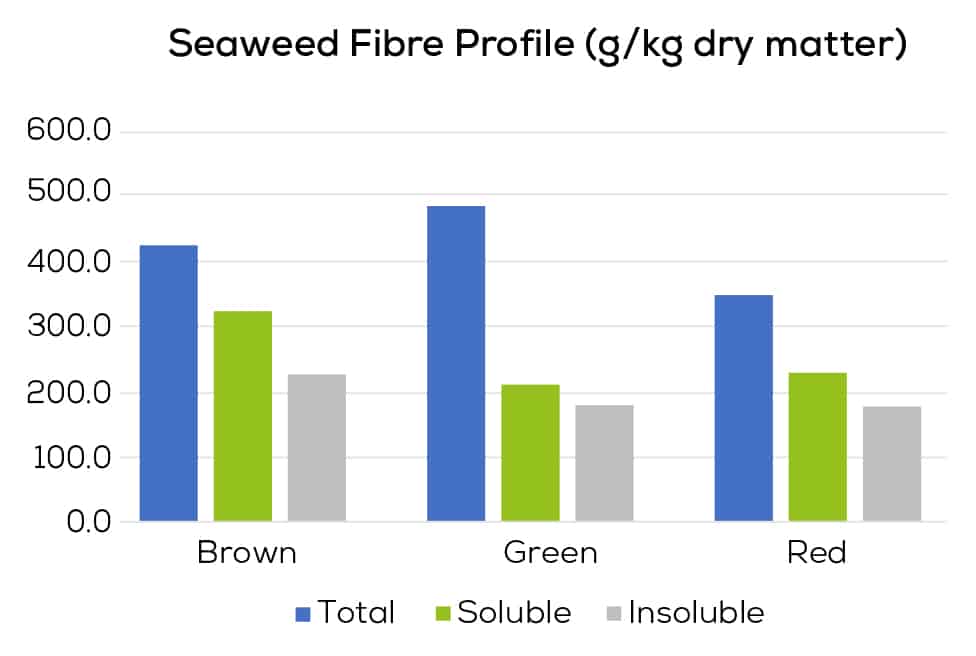 Unique polysaccharides or fibre found only in seaweed, account for around 30-75% of the dry weight of seaweeds, where they serve a structural role in cell walls (Xu et al, 2017). Of the total fibre in seaweed, only a proportion are soluble polysaccharides, posessing prebiotic activity. The soluble polysaccharides comprise around 55–65 % of total fibre in commonly used green and red seaweed but may be above 80 % in commonly used brown seaweed (Lahaye 1991; Figure 1). These soluble polysaccharides are particularly effective prebiotics in animals (Hentati et al, 2020).