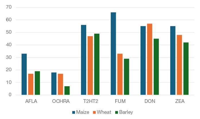 The mycotoxin data on raw materials and complete feed samples available in Trouw Nutrition’s Global Database was used to prepare the 2024 Global Mycotoxin Review. The report focused on “Big 6” mycotoxins, Deoxynivalenol (DON), T-2/HT-2 Toxin (T2HT2), zearalenone (ZEA), fumonisins (FUM), aflatoxin (AFLA), and ochratoxins (OCHRA), as these are often analysed at feed mills using rapid analytical tools and extensive research is available on their adverse effects in animals.