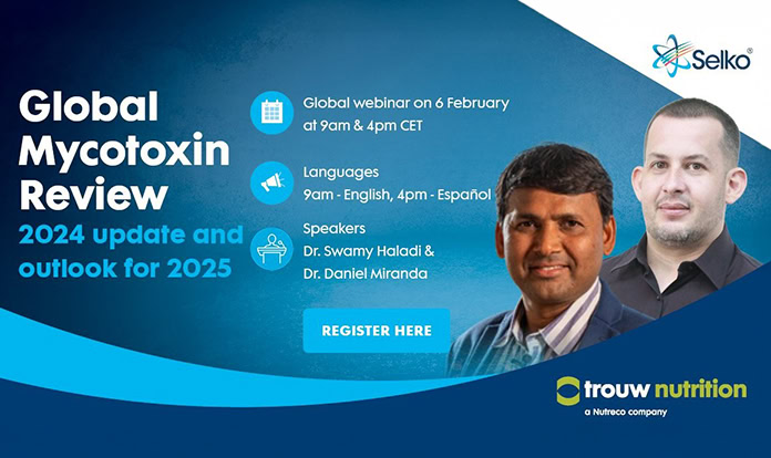 Selko, Nutreco’s feed additives brand, will share findings from its 2024 Global Mycotoxin Review during a live webinar on Thursday, 6 February. The webinar is free of charge and will be presented in English and Spanish versions. Dr. Swamy Haladi, Global Technical Commercial Manager for mycotoxin risk management will present the English language session from 9 am to 10 am CET and Dr. Daniel Miranda, Commercial Technical Manager – Americas, will present the Spanish language session from 4 pm to 5 pm CET.