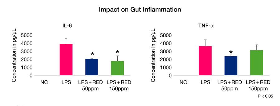 An in-vitro study conducted at the University of Wels, Austria, assessed the anti-inflammatory effects of Nuqo RED. The trial involved challenging macrophages with lipopolysaccharides (LPS) to induce an inflammatory response. The results demonstrated that Nuqo RED effectively reduced the production of pro-inflammatory cytokines, including Interleukin 6 (IL-6) and Tumor Necrosis Factor alpha (TNF-α), compared to the LPS control group. The highest anti-inflammatory efficacy was observed at 50 ppm, confirming Nuqo RED’s ability to modulate inflammation and support better gut health during stress conditions.
