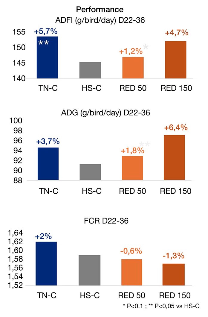 Results showed that broilers fed with Nuqo RED at 50 ppm showed improved feed intake (ADFI) and weight gain (ADG), recovering about half of the weight gain compared to the TN-C group. The highest improvement in performance was observed in birds fed with Nuqo RED at 150 ppm, which achieved feed intake levels comparable to the TN-C group and the best weight gain of all treatments. Additionally, the feed conversion ratio (FCR) improved by 1.3% in the 150 ppm group, showing a clear dose-dependent effect.