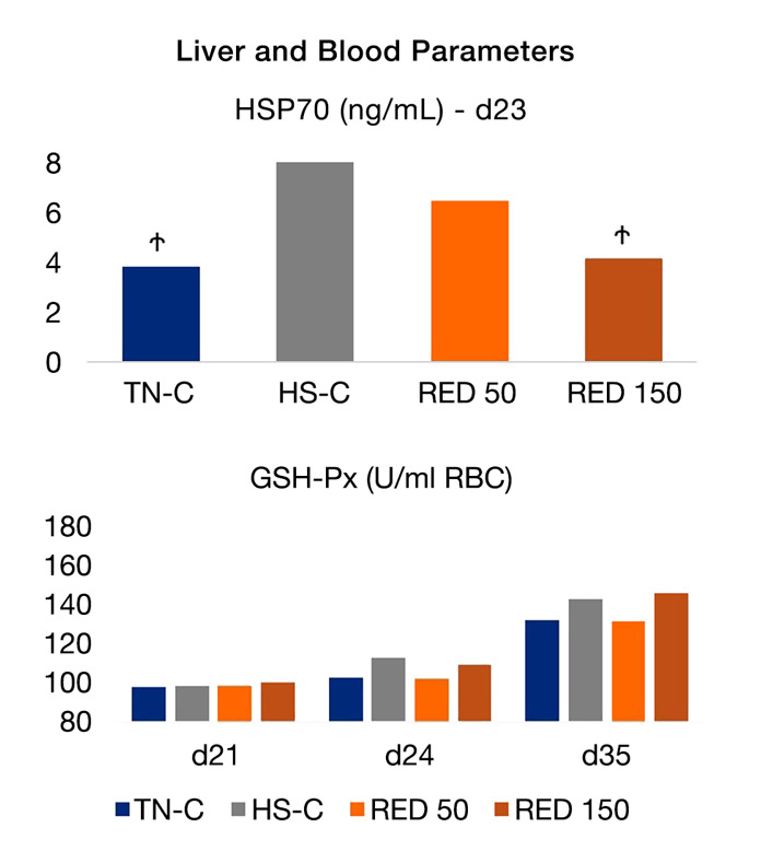 Moreover, the trial also measured stress biomarkers such as heat shock protein (HSP70) in liver tissue and levels of corticosterone and Glutathione Peroxidase (GSH-Px) in blood samples. While there was no significant difference in GSH-Px level in this trial, Nuqo RED at 150 ppm significantly reduced the HSP70 levels as compared to the Heat-stress control, indicating a lower stress level in the birds.. These results suggest that Nuqo RED not only improves performance under heat stress but also helps mitigate the physiological impact of stress on poultry.
