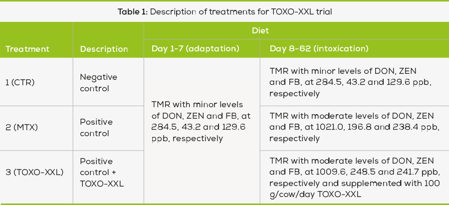 TOXO-XXL is Selko’s most broad-spectrum mycotoxin mitigation product encompassing four mode of actions – reduction in mycotoxin bioavailability, strengthening gut barrier function, modulation of immune response, and enhanced antioxidant status. Controlled research was carried out at University of Cattolica in Italy to understand the efficacy of TOXO-XXL in reducing the negative impact of multiple Fusarium mycotoxins on the dry matter intake (DMI), milk production, and rumination time. A total of 31 Holstein lactating cows were enrolled in the study, where 16 cows were used for a trial in the spring period and the trial was repeated in the following summer period with another 15 cows. Each period consisted of a 7-day of adaptation and a 54-day intoxication, where cows were blocked based on days in milk (DIM) and parity, and randomly assigned to specific treatments. Treatments are listed in Table 1. The daily milk production and milk composition was measured by AfiLab system. Cows were milked twice a day and weighted after each milking.