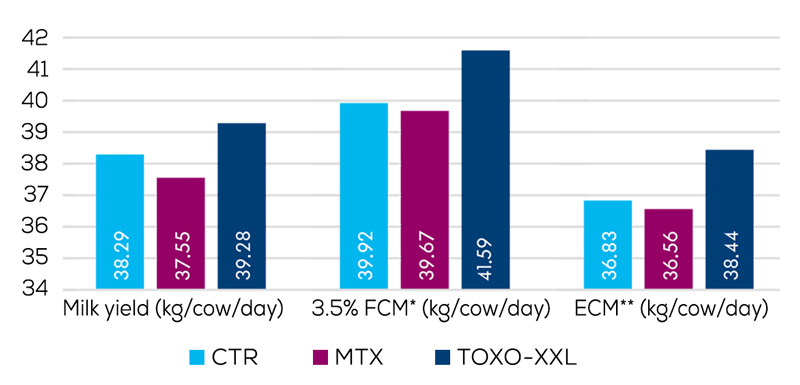 During a 54-day exposure to moderate levels of Fusarium mycotoxins, DMI (expressed as a percentage relative to body weight) reduced from 4.02 to 3.99%. Rumination time saw a reduction as well from 513 to 505 minutes. Additionally, milk yield decreased from 38.29 to 37.55 kg/cow/day (Figure 4). Supplementation of TOXO-XXL at 100 g/cow/day, however, was able to increase DMI, rumination time and milk yield to 4.09%, 525 minutes and 39.28 kg/cow/day, respectively.