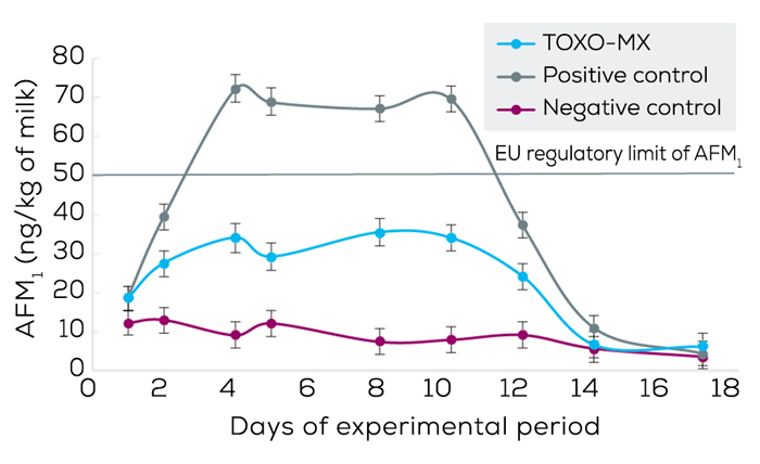 At the animal level, fortunately there are effective strategies to bind AFB1 in the intestine thereby preventing its entry into blood circulation. Selko has incorporated a high quality smectite binder in their product TOXO-MX and this product has shown to significantly lower AFM1 levels by 65%. Such effect was achieved at very low concentrations of AFB1 in TMR indicating product’s high affinity towards AFB1 (Figure 2).