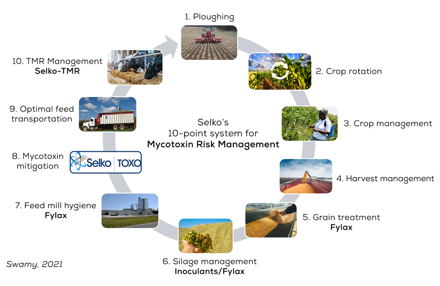 Mycotoxin mitigation strategies in dairy cows demonstrate the importance of an integrated approach. It starts from optimal crop management, includes harvesting and storage of raw materials and finally the management of TMR (Figure 1). Innovations in organic acid application (Selko Fylax range) are allowing for better storage of raw materials in silos, leading to optimal silage production and face management, and preventing heating of TMR (Selko-TMR). Mycotoxin mitigation products (Selko TOXO range) can be added to TMR directly or via concentrate to effectively reduce mycotoxin risk for animal health and human health, by keeping AFM1 levels within statutory limits.