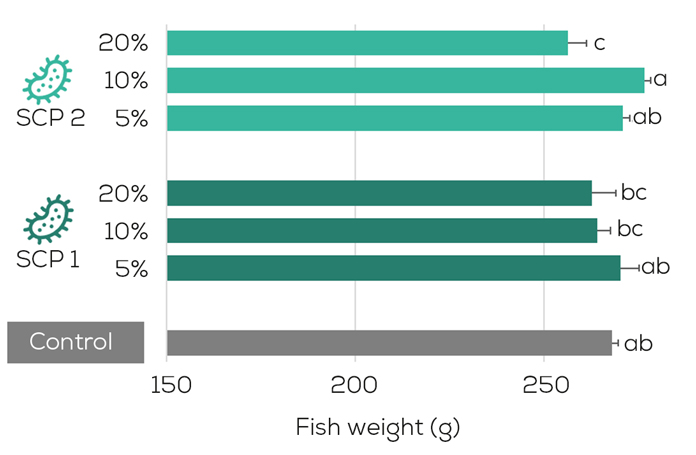 Early prototypes of a single cell protein produced by researchers at the DSM Bioscience Centre in Delft, The Netherlands showed excellent performance comparable to feeds containing fish meal and soy protein concentrate. Rainbow trout were grown for 12 weeks on different inclusions of SCP ranging from 0%, 5%, 10% to 20% on extruded feeds, with single cell protein replacing a combination of fish meal and soy protein concentrate. The data is shown in Figure 1, indicating that single cell protein inclusion has no negative impact on fish performance measured by final body weight.