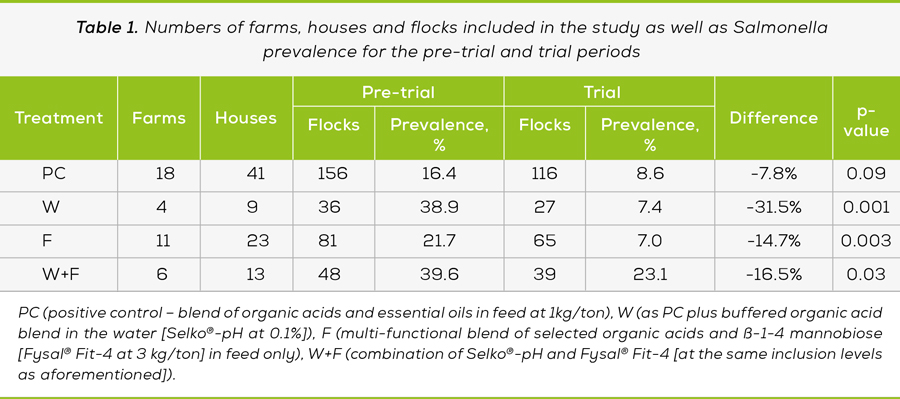 Control farms (PC – positive control) continued to use the feed additive blend (organic acids + essential oils, 1 kg/ton) without a water additive. Water farms (W) continued to use the feed additive blend in combination with a buffered organic acid blend in the Water (Selko®-pH at 0.1%). Feed farms (F) switched to a multi-functional blend of selected organic acids and ß-1-4 mannobiose (Fysal® Fit-4 at 3 kg/ton) in feed only. Water + Feed (W+F) farms switched to a combination of Selko®-pH and Fysal® Fit-4 (at the same inclusion levels as aforementioned). No other management changes were implemented.