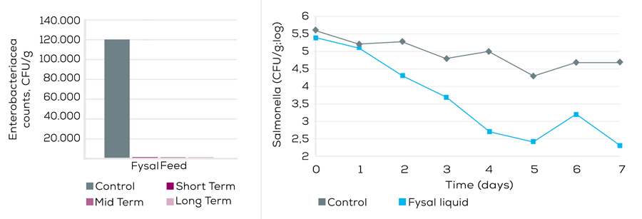 Assuring safe feed is not a “one-and-done” challenge and the risk doesn’t end once hygiene/decontamination efforts are deployed during processing. Feed can potentially be re-contaminated along subsequent steps, and even during storage, transportation and delivery to poultry farms. Inclusion of proper types and levels of organic acids in the feed matrix can reduce the risk of recontamination. Selko offers Fysal®, a product portfolio containing a potent blend of free and buffered organic acids and their salts, with proven efficacy in reducing Enterobacteriaceae (Figure 1a), and specifically, Salmonella (Figure 1b), in animal feed.