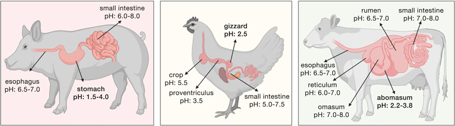 Nutrients such as carbohydrates, fats, proteins, including minerals and vitamins, are primarily absorbed within the intestine. Before reaching this organ, the ingested bolus has to pass through an acidic environment: the stomach. The gastric milieu plays a crucial role in the digestion process across animal species, facilitating the activation of enzymes and the pre-digestion of proteins and lipids.
