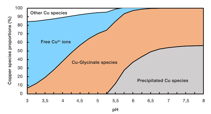 The stability of chelates can be severely affected by pH. An in silico simulation (Figure 2) represents a model of the copper-glycinate complex behavior in water at varying pH levels. Initially, before any interaction with water, copper is entirely bound to glycine in a stable complex. However, when the pH is lowered to 3, approximately 80% of copper becomes free ions (Cu2+), indicating reduced stability of the complex. On the contrary, at high pH levels, both the complex and precipitated forms equally make up 50% of copper, with no free ions present, suggesting a less reactive complex. The figure also shows that at pH 5.25, only 70% of the chelate is available, highlighting its decreased proportion as the pH decreases. This emphasizes the partial dissociation of chelates in acidic stomach conditions and potential chelate reformation or formation of other complex with organic molecules present in the higher pH environment of the small intestine.