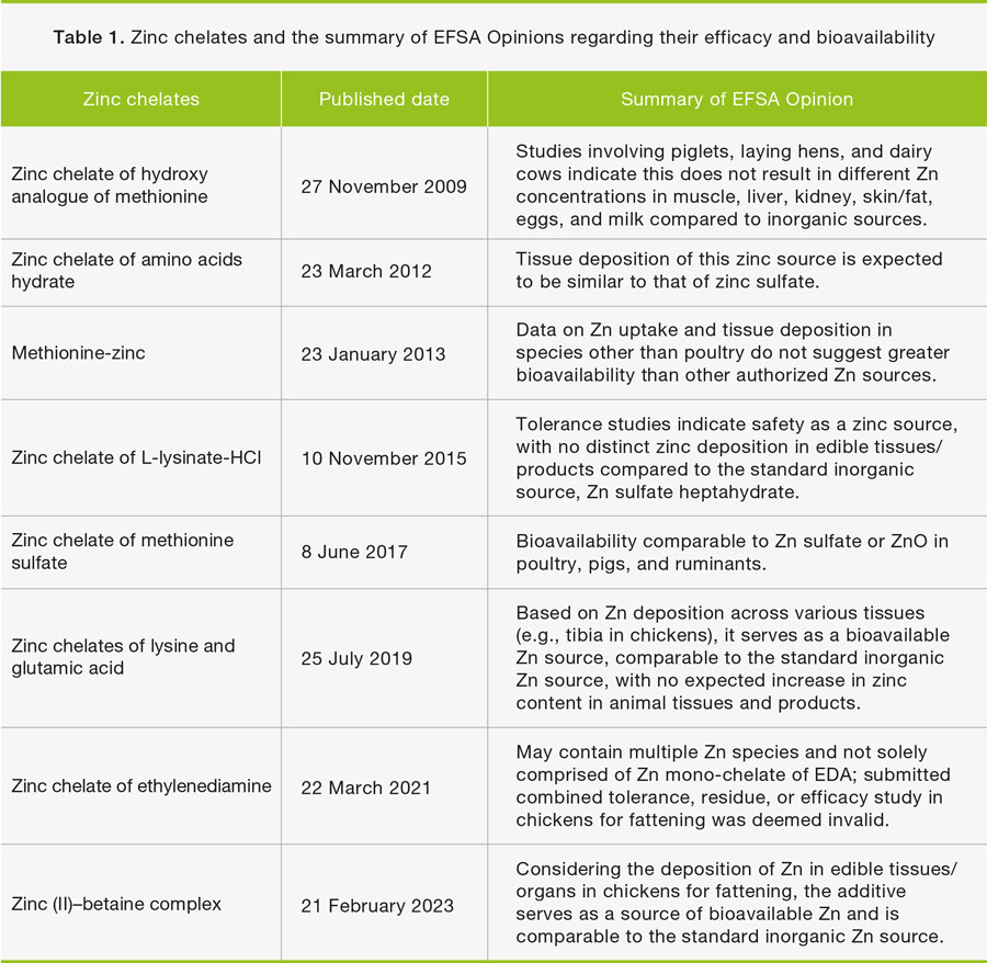 In the animal nutrition industry, various chelated Zn sources have been marketed for their claimed superior bioavailability over traditional sulfates. However, it is crucial to highlight that EFSA’s opinions have not definitively concluded on this matter. To date, EFSA’s scientific evaluations consistently challenge these claims of higher bioavailability for chelated Zn sources compared to standard sulfates (Table 1). An optimal chelating agent should possess a stability constant that can balance effective sequestration from feed materials and efficient uptake by the animal.