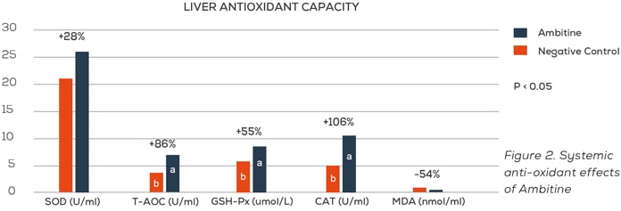 Secondly, restoring the balance between pro-oxidants and antioxidants while reducing inflammation are detrimental to keep up the momentum of feed efficiency in fattening pigs. In the last weeks before market, pigs fed Ambitine® supplementation experienced an improved daily weight of +4,2% and reduced feed conversion of 2,6% on average. The Ambitine® technology aims at compensating this potential performance decline not only by supporting gut function but also by increasing resilience towards external stressors. This stress resilience was recently highlighted in a Chinese study where parameters such as oxidative stress and inflammation were measured. On the one hand, the Ambitine® treatment improved the liver antioxidant capacity with increase in levels of antioxidant enzymes such as superoxide dismutase, glutathione peroxidase, catalase and malondialdehyde (See Fig 2). And on the other hand, the immune response to stress was optimized in finishing pigs treated with the Ambitine® as the concentration of key pro-inflammatory markers was lower compared to a control diet (See Fig 3).