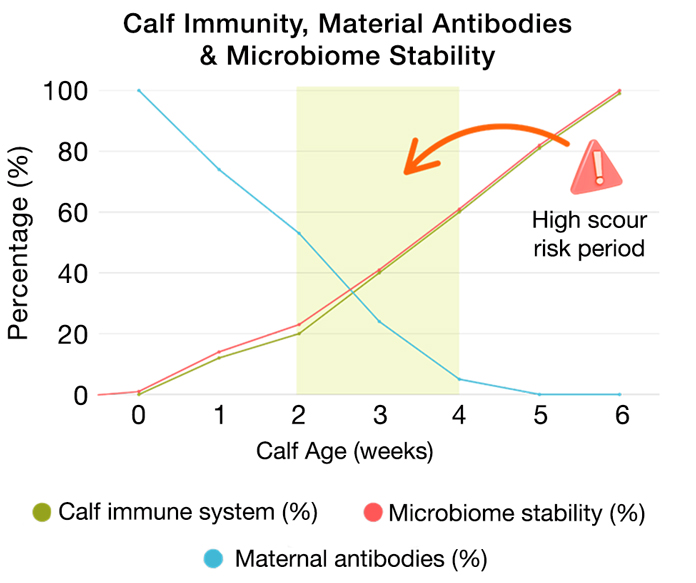 This creates a vulnerable gap where the calf’s defenses are at their lowest—just when exposure to environmental pathogens is high. During this period, any stress, nutritional imbalance, or microbial disturbance can tip the balance toward disease.