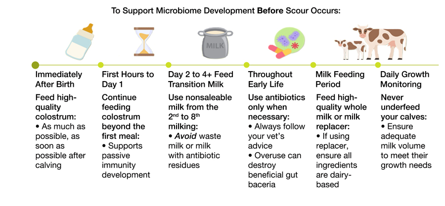 The good news is that the microbiome can recover if the calf is properly supported. Management practices that protect microbial community balance can help reduce the risk of scour and improve overall calf performance. Key strategies include: