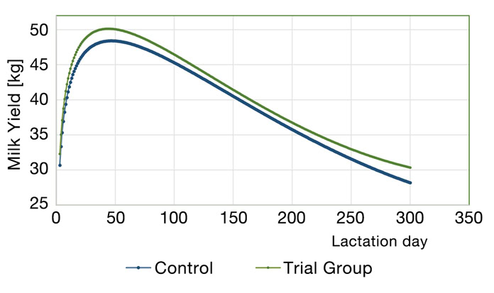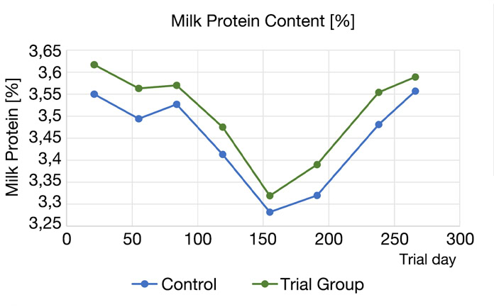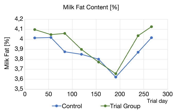 Initial findings from practical trials and a master’s thesis reveal that the inclusion of DOSTO® bi-active in dairy cow concentrate or mineral feed led to increased milk yield and improved milk components (fat and protein content). Notably, a positive side effect observed was a reduction in somatic cell counts and the occurrence of ketosis (Figure 1-3).