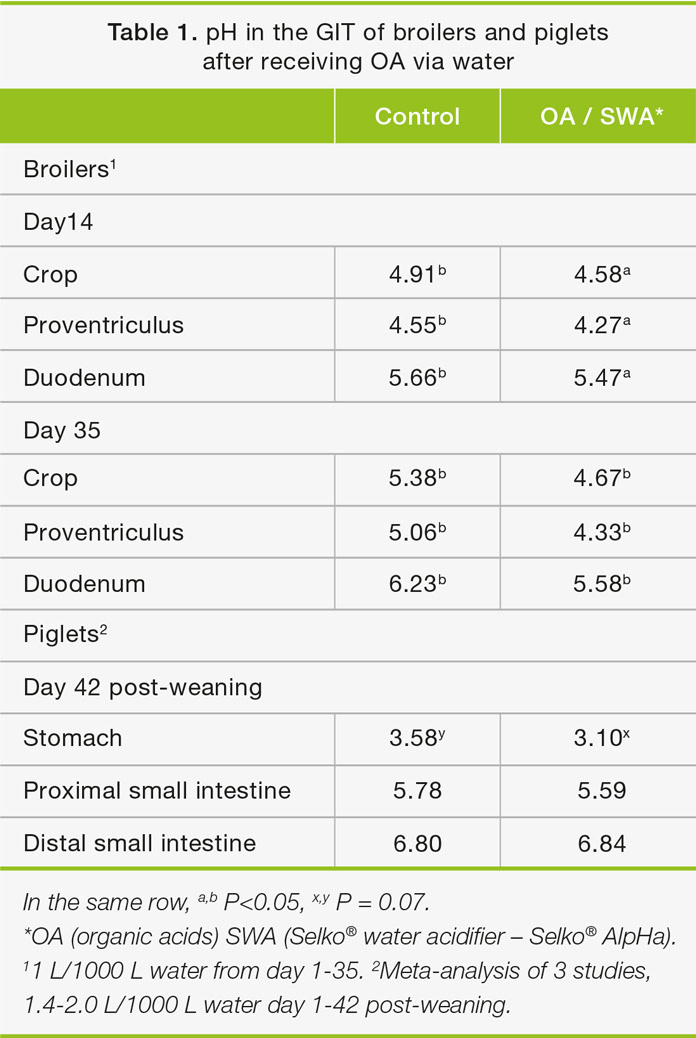 Trial takeaway: A 35-days study performed by Trouw Nutrition tracked the GIT pH of broilers and showed that the SWA reduced the pH in the crop, proventriculus, and duodenum (Table 1).