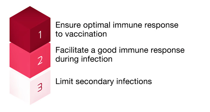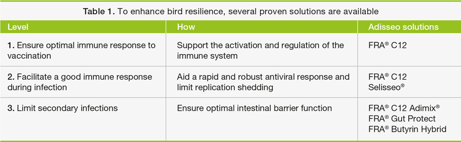 Poultry production has become more efficient over the last decades. At the same time, this requires extra care to prevent stressors and infectious diseases to keep the flocks healthy and productive. In addition to traditional practices like vaccination strategies and biosecurity protocols, numerous emerging solutions such as the supplementation of certain feed additives in animal diets are evaluated for their potential to enhance animal health and resilience. Adisseo strongly believes that animal nutrition plays a crucial role in supporting three steps: ensuring optimal immune response to vaccination, facilitating a good immune response during infection and limiting secondary infections (Figure 1). To achieve these goals, Adisseo has selected specific solutions for each step (Table 1).