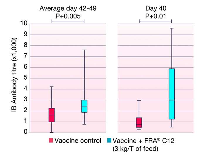 In a study by De Gussem et al. (2021), the effect of FRA® C12 Dry on infectious bronchitis virus (IBV) vaccination was evaluated in Ross 308 broilers. This study showed that FRA® C12 (at 3 kg/ton) did not influence oral IBV vaccination efficacy but, in contrast, has the potency to stimulate the (secondary) immune response that is elicited upon vaccination. A substantial increase in average IBV titre values was detected (Figure 2). FRA® C12 also stimulated INFγ, a type 1 cytokine that plays an important role in activating cellular mechanisms that lead to enhanced adaptive immune responses against (viral) pathogens.