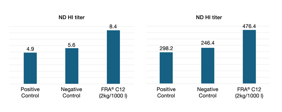 Supplementing drinking water with lauric glycerides showed similar positive results when used during Newcastle Disease (NCD) and IBV vaccination. The results were compared with the data from the negative control group and a group of broilers that received an antibiotic growth promoter (AGP). Dosed at 2 litres per 1000 litre drinking water, FRA® C12 Liquid significantly improved weight gain, feed intake and FCR compared to the negative control group. In addition, this dosage also increased antibody titres for NCD and IBV were increased in broilers, suggesting an improved immune response (Figure 3).
