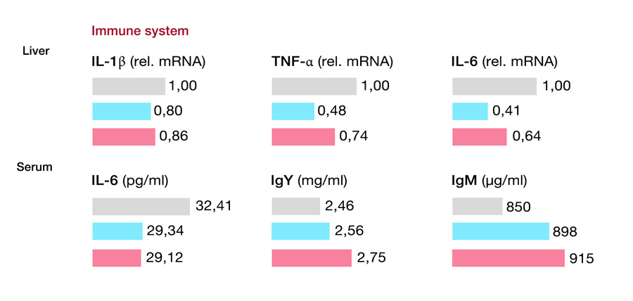 Adimix® Precision is Adisseo’s precision delivery coated sodium butyrate that boosts intestinal development and resilience and reduces intestinal pathogen contamination, ultimately improving performance. A recent study in China (Xia et al., 2025) with 540 Hy-Line Brown Hens of 45 weeks of age assessed the benefits of supplying Adimix® at a dosage of 1 kg / T of feed. It was shown that Adimix® helps to reduce pro-inflammatory signals in the liver and support the immune response in the serum (Figure 4). Performance parameters were also improved.