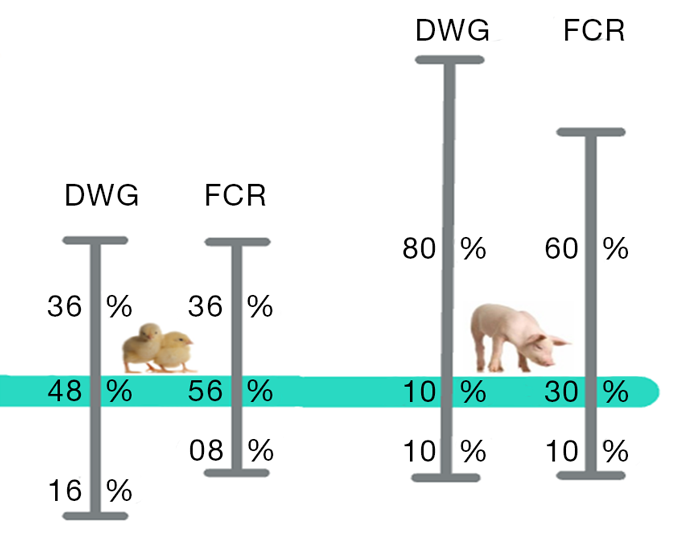 Figure 1 illustrates the comprehensive results from a large number of trials. When comparing performance outcomes with antibiotics as the control group, the data reveal that in 48% of the trials, eubiotics matched the daily weight gain of chicks achieved with antibiotics. In 36% of the trials, eubiotics outperformed antibiotics, while in 16%, the results were slightly lower than those of the antibiotic control group. Overall, these findings highlight that eubiotics are effective and recognized as viable alternatives to antibiotics for growth promotion in livestock.