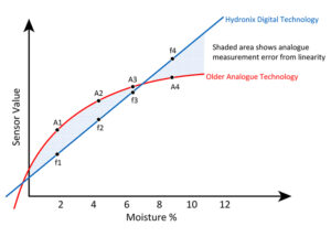 Older technology sensors using either resistive, capacitive, or analogue microwave techniques have a non-linear calibration, so a graph of the sensor value against the moisture change has a curve labelled as ‘Older Analogue Technology’ in Figure 2.