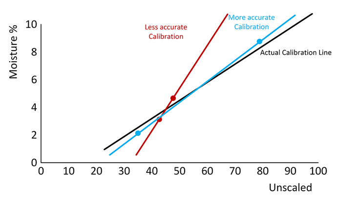 In Figure 3, all the samples have a 0.3% error from the actual moisture. By using low and high moisture samples that have a wider range (shown in blue), the influence of the errors is reduced. This provides a much more accurate calibration line than using samples that are close together (shown in red).