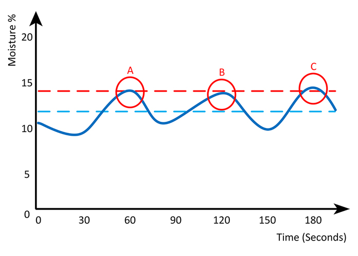 If the real-time process shown in Figure 1 is tested by collecting samples at the three marked points, these would average at 14% moisture, as shown by the upper line.