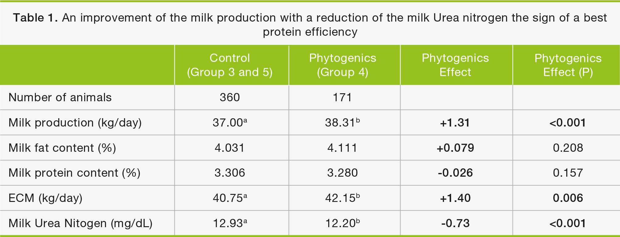 A phytogenic feed solution was tested in a field trial in China, including a local diet. This product has shown to improve milk production and energy corrected milk significantly, together with an improvement of the milk quality (Table 1).
