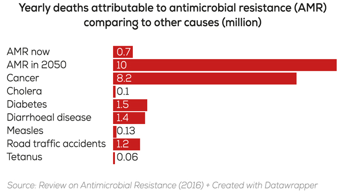Fast-forward nearly 80 years and AMR is one of the biggest threats in global health, food security and development today, according to World Health Organization (WHO). In 2019, almost 1.3 million deaths directly resulted from illnesses caused by drug-resistant bugs, according to a report released by the Lancet, a medical journal, on January 20, 2022. The large-scale use of antibiotics could lead to the death of up to 10 million people by 2050, meaning that one life will be taken every three seconds. In other words, superbugs could be a bigger killer than cancer, as projected in the chart (on the right).