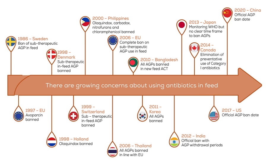 Currently, the main uses of antibiotics in poultry productions are to treat disease, prevent disease or promote growth. The first use must exclude medically important antibiotics for humans in many countries now. The second and third uses are being increasingly restricted, as shown in the timeline below.