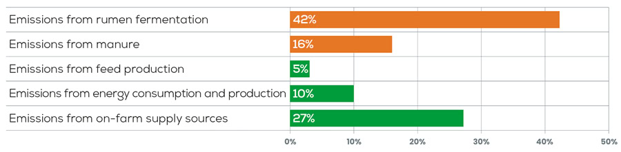 Reports indicate that 27% of the total carbon footprint of a dairy farm are emissions from on-farm supply sources, including emissions from the production of feed supplied to the farm (see Figure 1).