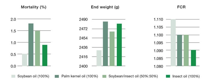 A study conducted by a Dutch feed company showed that Protix’s LipidX is a great alternative to the soybean and palm oil kernel commonly used. A diet with 100% insect oil resulted in an improved feed conversion ratio (FCR), better growth and reduced mortality compared with a control diet based on plant and vegetable oils (Figure 1).
