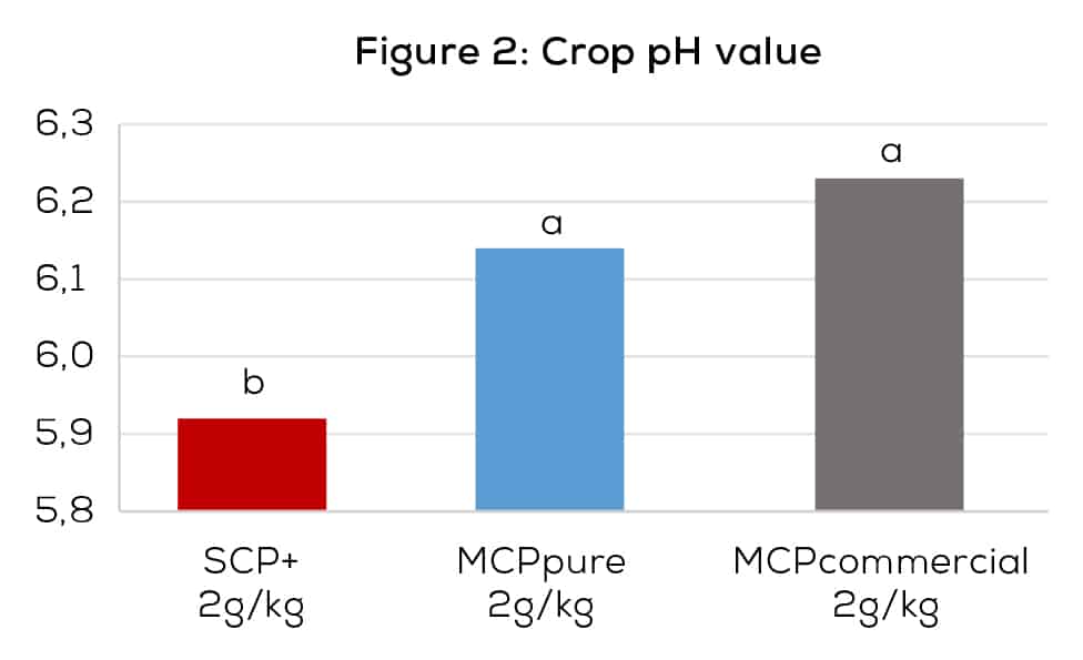 To evaluate the acid-binding capacity of the feed, the amount of HCL necessary to reduce the initial pH at 3 (ABC-3) was evaluated. The diet with Socalphos + showed a lower ABC3 value than the monocalcium forms (186 vs 281 and 279 mEqHCl/kg), which is in line with a lower feed pH (5.9 vs 6.2 and 6.1). As shown by the crop pH value results in Figure 2, there was a significant (P<0.05) reduction in the inclusion of sodium and calcium mineral phosphates in the animals fed with Socalphos+ (pH 5.92). The improved acidification seen with SCP+ will have positive effects on feed digestibility in general, and on phosphorus digestibility in particular.