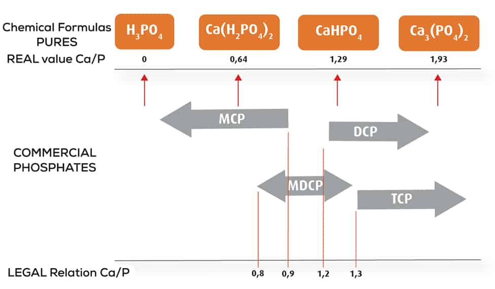 As shown in Figure 1, European regulations have established classification intervals for phosphates based on the Ca/P rate (Regulation EC 1017/2017). At a higher Ca/P rate, the incorporation of dicalcium phosphate increases in the mineral composition of phosphate, until reaching tricalcium phosphate at its highest rate.