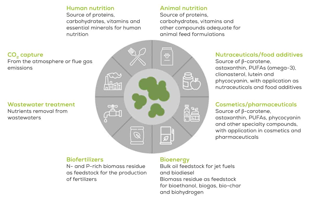 Microalgae play a vital role in aquatic ecosystems being the foundation of the food chain for all aquatic organisms. They perform photosynthesis, which is an important natural mechanism to reduce the atmospheric carbon dioxide concentration through converting sunlight, water and CO2 to algal biomass and oxygen. It is estimated that these single-celled microorganisms produce most of the oxygen we breathe. They are also able to lower the concentrations of nitrogen and phosphorus in wastewater and help tackling the environmental pollution and climate change.