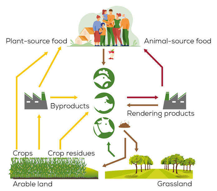 Historically, animals were fed with food- and crop waste from farms. If we want to understand the future role of animals in a sustainable world, we could look at that past and learn from it in order to avoid competition for limited resources between human- and animal food as much as possible. At the moment, some circular raw materials are already widely used. According to FEFAC, side streams and byproducts are considered as such when they are obtained from a process where the main activity is to obtain consumer goods, such as beverages, food, biofuels or other industrial applications. Examples are distillers dried grains (DDGS) which are spent grains and yeast cells from bioethanol or alcoholic beverages production, hulls from legumes or nuts, potato peels, sugar beet pulp, and even processed former foodstuffs from chocolate bars or biscuits2. They are often not fit for human consumption, but nevertheless can be valuable for animals. In this sense, animals can serve as biological recycling bins by upcycling circular raw materials into valuable animal products (Figure 1).