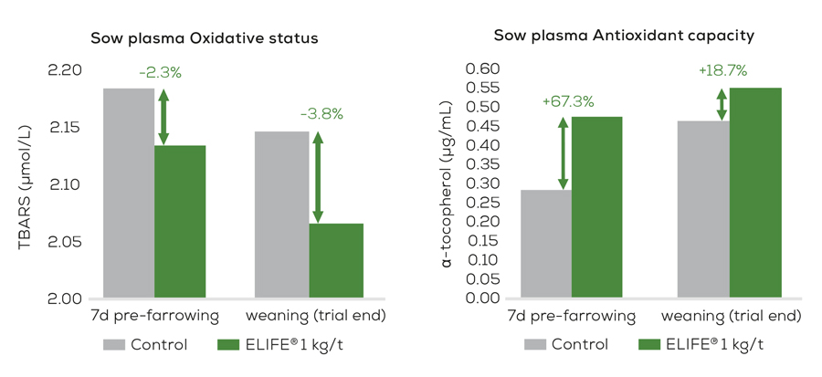 By measuring oxidative stress in species who are especially prone for it, the impact of the use of oxidation-inducing byproducts can be correctly evaluated. For example, based on a sow trial with IMASDE in Spain, we have shown that increased oxidative stress occurs during the pre-farrowing and lactation period, affecting performance (Figure 3 (A), (B)). Due to the increase in energy utilization required for milk synthesis, a shift from anabolic to catabolic metabolism occurs, increasing the level of free radicals. It is because of this reason that plasma TBARS levels, which are a byproduct of lipid peroxidation, are at their highest during this period. To combat oxidation, sows will consume great levels of vitamin E because of the increased metabolic requirement of antioxidants. Because used vitamin E is lost, it is therefore more effective to combat oxidative stress on a systemic level with ELIFE®, instead of supplementing additional levels of dietary vitamin E, which will be consumed. Additionally, based on a previously published layer trial, we have indications that our natural polyphenols have a vitamin E protecting function. Old birds like laying hens after peak production are known to have a reduced endogenous antioxidant enzyme secretion. This also makes them more prone to oxidative stress. Our research showed that laying hens during phase II have increased ROS in the egg yolk, while vitamin E levels are increased in egg yolk after supplementation with ELIFE®. Our biomarker research indicated that already with conventional feed, oxidative stress is an underestimated problem. We see it as our mission to raise awareness around oxidative stress.