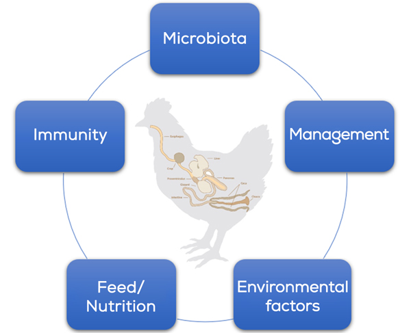 A healthy gut is vital for the proper digestion and absorption of nutrients. In addition, the gut is critical for the animal to survive the stressors to which the body is exposed to throughout the gastrointestinal tract, and in maintaining homeostasis. Developmental stages and immune status of the bird, the quality of feed ingredients, changes in feeding phases, environmental stressors, management, and pathogens are some of the things that can disrupt homeostasis and affect gut health (Figure 1). Maintaining the integrity of gut tissue, nourishing a healthy microbiome, along with supporting an effective immune system are the main components to a healthy gut. From an animal production perspective, gut health is closely related to animal performance, welfare, and food safety.