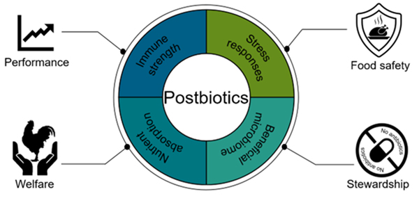 Antibiotics are used in poultry production, mainly to improve gut health and performance. However, owing to growing concerns about the use of medically important antibiotics in livestock production and the associated challenges, poultry producers need effective holistic approaches including – management and nutrition – to support antibiotic stewardship. Currently, several dietary measures are taken to promote animal health in poultry production. Among these, an emerging group being included in holistic approaches that shows promise in improving gut health and host defense is postbiotics.