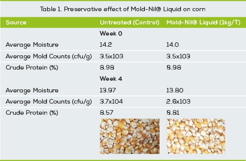 Mold growth concerns in corn have been mainly attributed to the potential formation of mycotoxins and their negative effects on animal performance. Often overlooked is the potential negative impact of storage on the nutritive value of corn, i.e., crude protein content. After one month, Mold-Nil® Liquid, versus a negative control, prevented the loss of ~1.9% crude protein and was able to further control the contamination of mold and mycotoxins during storage. In contrast, the untreated control with 14% initial moisture content was moldy after a short period of time. As shown in Table 1, corn without a Mold-Nil® Liquid treatment lost 4.2% crude protein due to fungal growth, which is of economic significance due to reduced processing and nutritional quality of the corn.