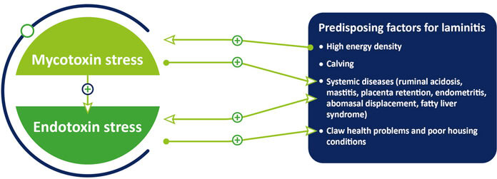 The clinical picture develops as a result of the direct cytotoxic effects of the various mycotoxins as well as the metabolic stress they cause. Thus, the mycotoxins can also promote the development of complex metabolic disorders and inflammatory diseases. Laminitis is a good example.