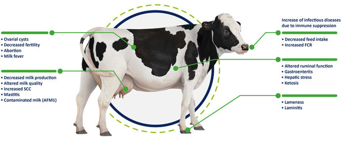 There is a very significant risk that relevant amounts of mycotoxins will not be degraded in the rumen. This results in a generally unspecific reduction in zootechnical performance and animal health.