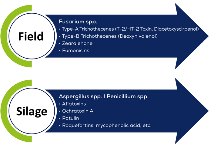 Grass silage and green forage can also be contaminated with deoxynivalenol, ergot alkaloids, or other mycotoxins. Overall, there is a risk of a wide variety of different mycotoxins from many different sources. This is aggravated by the high dry matter intake of a dairy cow, which consequently leads to a higher total amount of mycotoxins ingested.