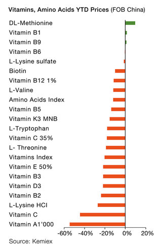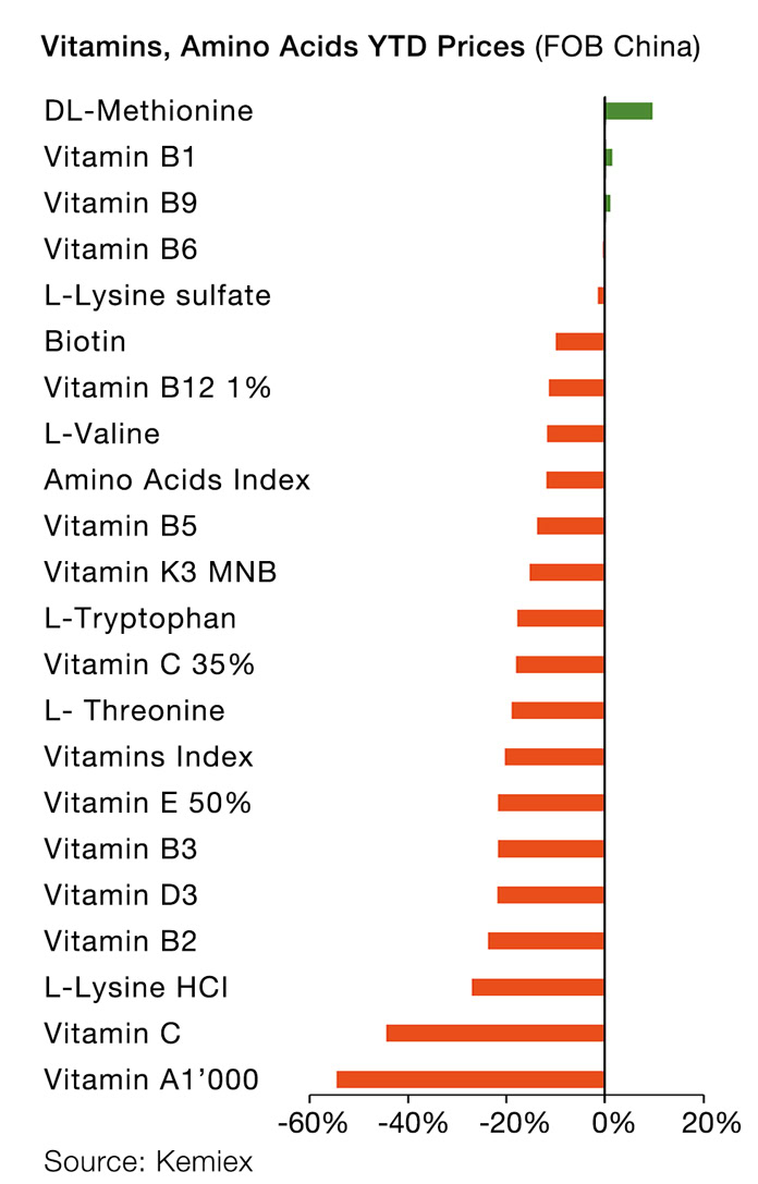 2024 was a year that saw a recovery for production and trade volumes, and prices for vitamins after a weak 2023. This was partly driven by producers’ efforts to maintain profitability and by supply chain disruptions following a chemical factory accident in Germany in July, affecting Vitamins E, A, precursors and carotenoids. In parallel, the fourth quarter of 2024 saw significant demand and front-loading of shipments to land in U.S. ports before late January and the incoming president.