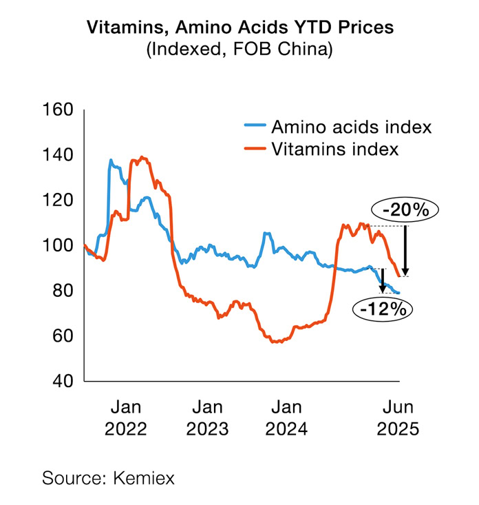 Most feed additives saw a considerable drop in prices towards June 2025. DL-Methionine, Vitamins B9 and B1 were notable exceptions, as the downward correction was led by Vitamin A, Vitamin C, Lysine HCl, Vitamins B2, B3, E 50% and amino acids such as Threonine, Tryptophan and Valine. The Kemiex Vitamins Index dropped -20% year-to-date but remains +31% higher than in May 2025. The Kemiex Amino Acids Index is down only -12% year-to-date, and -14% year-on-year.